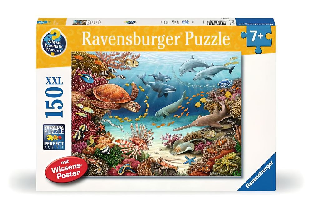 Das Puzzle Wieso? Weshalb? Warum? Meerestiere am Korallenriff (150 Teile) verbindet spielerische Unterhaltung mit anschaulichem Sachwissen. Das farbenfrohe Motiv zeigt eine lebendige Unterwasserwelt mit verschiedenen Fischen, Meeressäugern und Pflanzen und lädt Kinder dazu ein, Details zu entdecken und Fragen zu stellen.