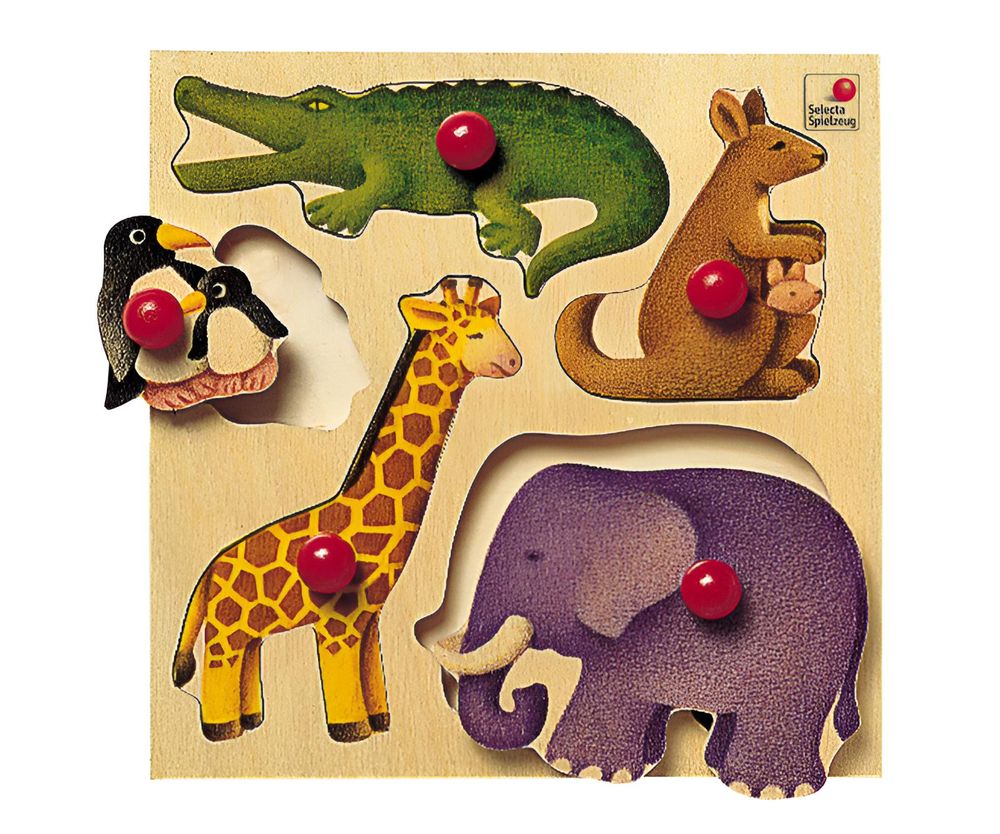Zu Besuch im Zoo: Der Elefant und seine Freunde suchen ihren richtigen Platz. Spielerisch lernen die Kinder, die Teile aufgrund ihrer Kontur richtig zuzuordnen. Greifpuzzle mit 5 Tiermotiven und großen Griffknöpfen.