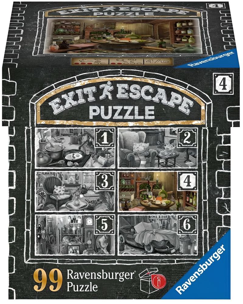 EXIT Puzzle von Ravensburger! Puzzeln, Rätseln, Lösen. Gelingt es, die Puzzleteile an ihren Platz zu legen, die Rätsel zu finden und sie zu knacken? Verschiedene Schwierigkeitslevel der Puzzles garantieren ein abwechslungsreiches Puzzle- und Rätselvergnügen! In der Schachtel befindet sich ein Puzzle mit 99 geheimnisvollen Teilen. Die dazugehörige Anleitung sowie die Lösung können online eingesehen werden.