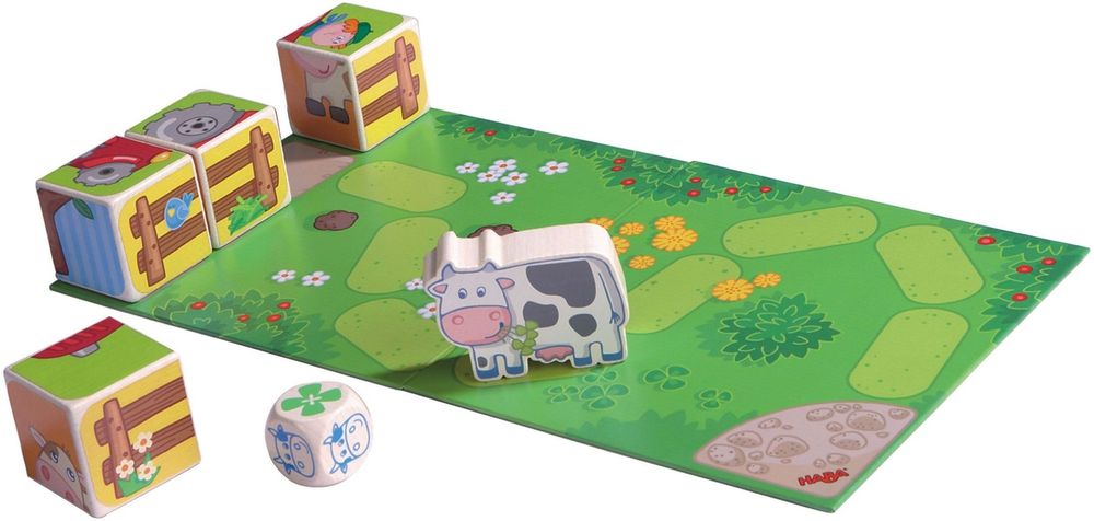 Wer kann die Puzzlewürfel so drehen, dass sie sich zu einem Bild zusammenfügen lassen? Auch das kleine Regelspiel macht viel Spaß, denn ihr versucht gemeinsam mit Kuh Carola die Weide zu verlassen, bevor der Bauer das Gatter schließt. Ein tierisch lustiges Würfelpuzzle.