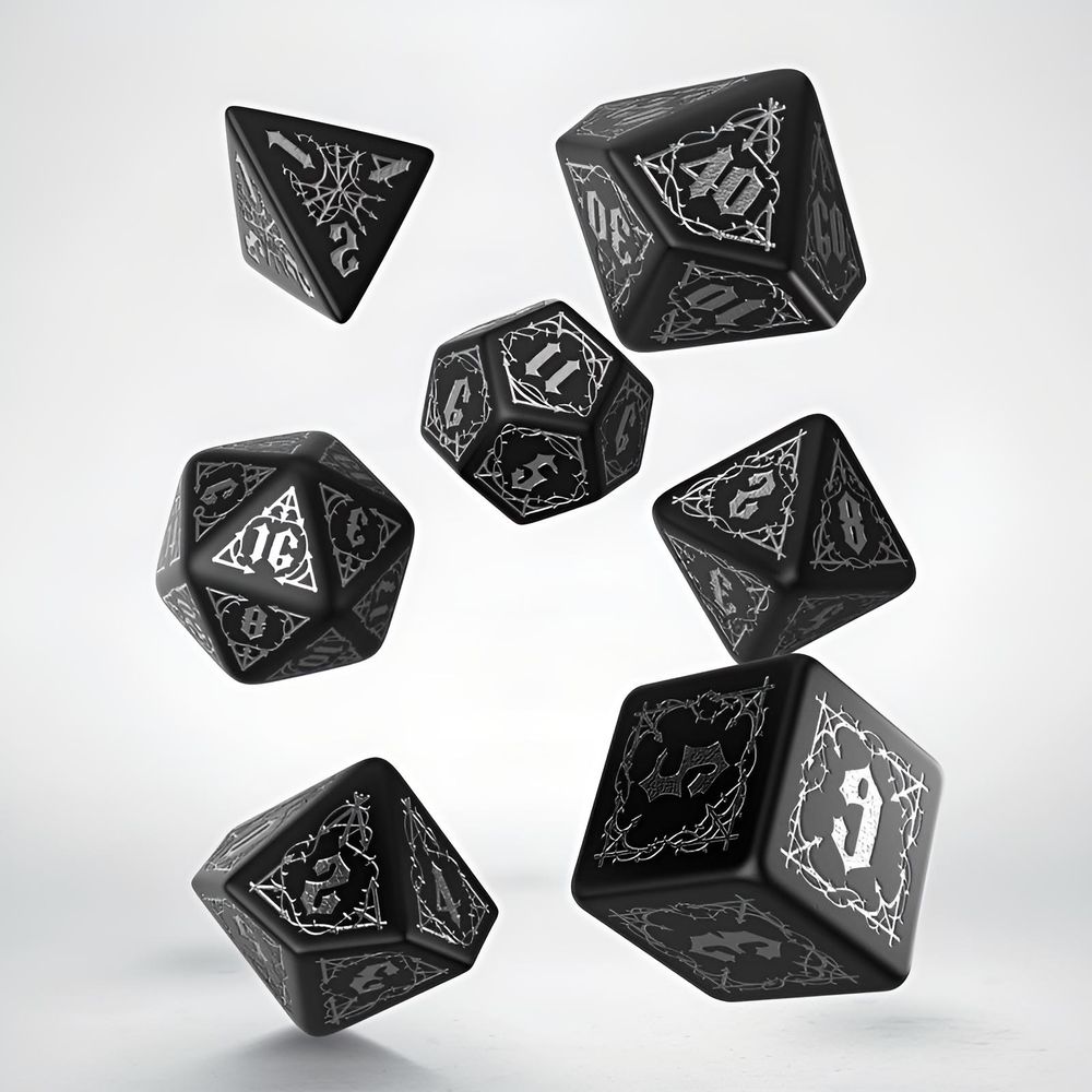Das Bloodsucker Black & Silver Dice Set (7) ist ein stilvolles Würfelset für Rollenspielrunden und Tabletop-Abenteuer. Die Kombination aus tiefem Schwarz und markanten silbernen Akzenten sorgt für eine edle, gut lesbare Optik am Spieltisch. Durch das ausgewogene Gewicht und die klaren Kanten liegen die Würfel angenehm in der Hand und rollen zuverlässig über jede Unterlage.