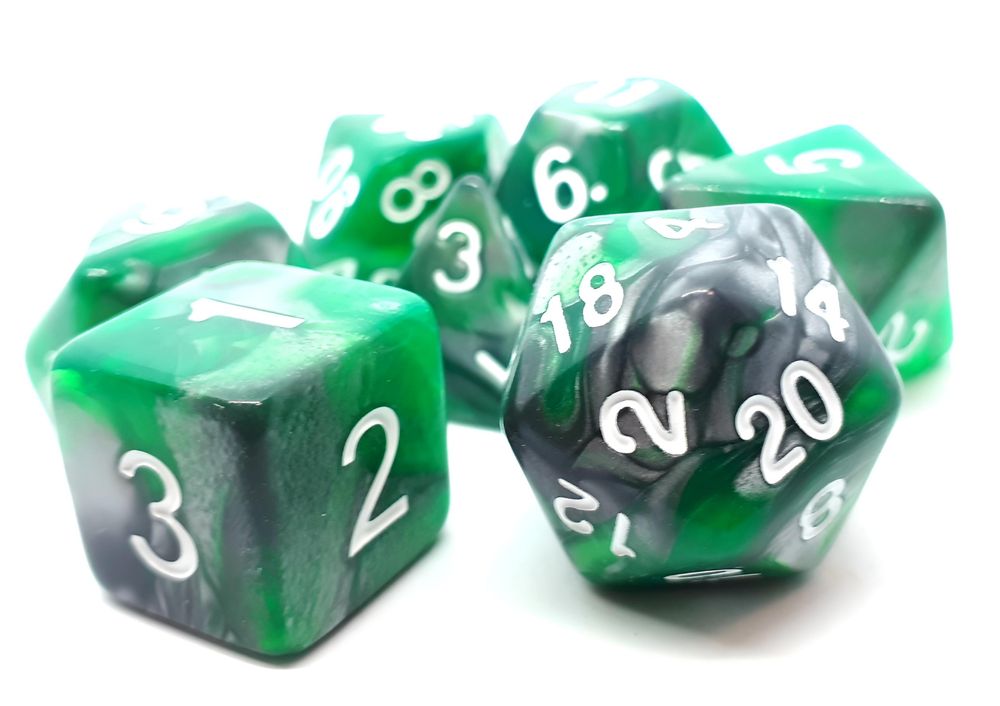7-teiliges polyedrisches RPG-Würfelset bestehend aus den spieltypischen und relevanten RPG-Würfeln: D4, D6, D8, D10 (0-9), D10 (00-90), D12 und D20.