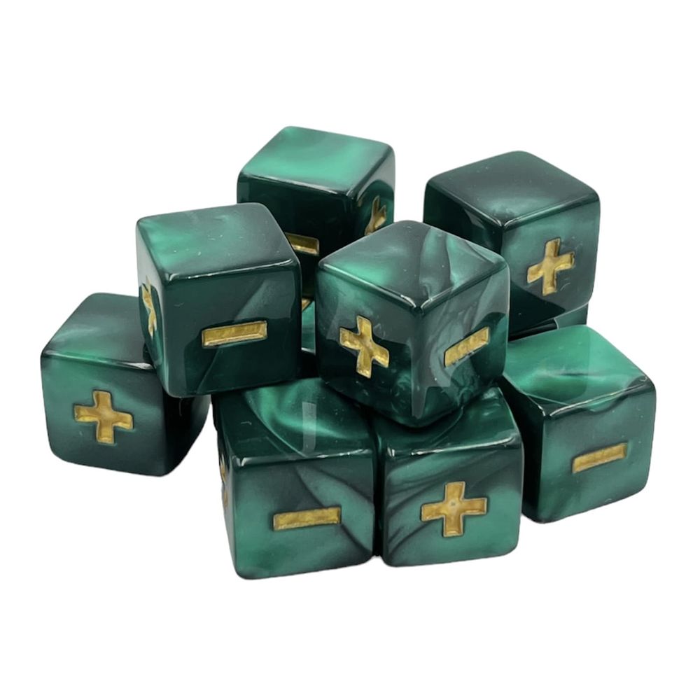 Das Würfelset Fate/Fudge Marble Darkgreen ist die ideale Ergänzung für Erzähl- und Rollenspiele, bei denen die Geschichte im Vordergrund steht. Die zwölf Würfel präsentieren sich in einem marmorierten Dunkelgrün, das durch edel wirkende goldene Symbole stilvoll hervorgehoben wird. Jede Seite ist entweder leer oder mit einem Plus- beziehungsweise Minuszeichen versehen und eignet sich damit perfekt für Fate- und Fudge-Regelsysteme.