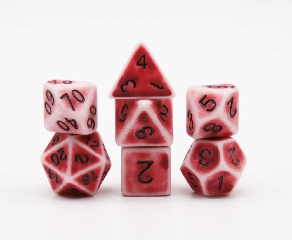 7-teiliges polyedrisches RPG-Würfelset bestehend aus den spieltypischen und relevanten RPG-Würfeln: D4, D6, D8, D10 (0-9), D10 (00-90), D12 und D20.