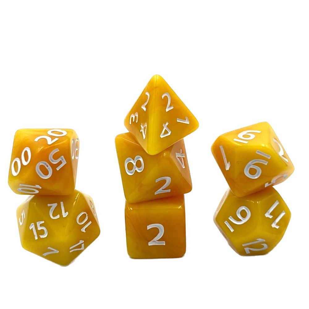 7-teiliges polyedrisches RPG-Würfelset bestehend aus den spieltypischen und relevanten RPG-Würfeln: D4, D6, D8, D10 (0-9), D10 (00-90), D12 und D20.