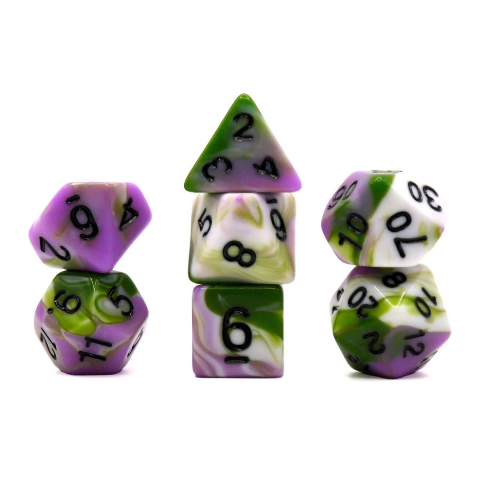 7-teiliges polyedrisches RPG-Würfelset bestehend aus den spieltypischen und relevanten RPG-Würfeln: D4, D6, D8, D10 (0-9), D10 (00-90), D12 und D20.