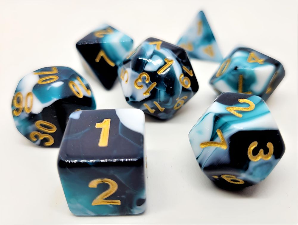 7-teiliges polyedrisches RPG-Würfelset bestehend aus den spieltypischen und relevanten RPG-Würfeln: D4, D6, D8, D10 (0-9), D10 (00-90), D12 und D20.