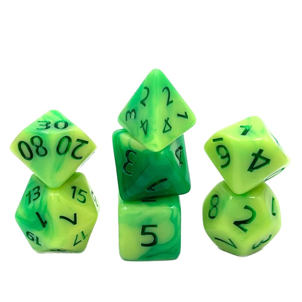 7-teiliges polyedrisches RPG-Würfelset bestehend aus den spieltypischen und relevanten RPG-Würfeln: D4, D6, D8, D10 (0-9), D10 (00-90), D12 und D20.