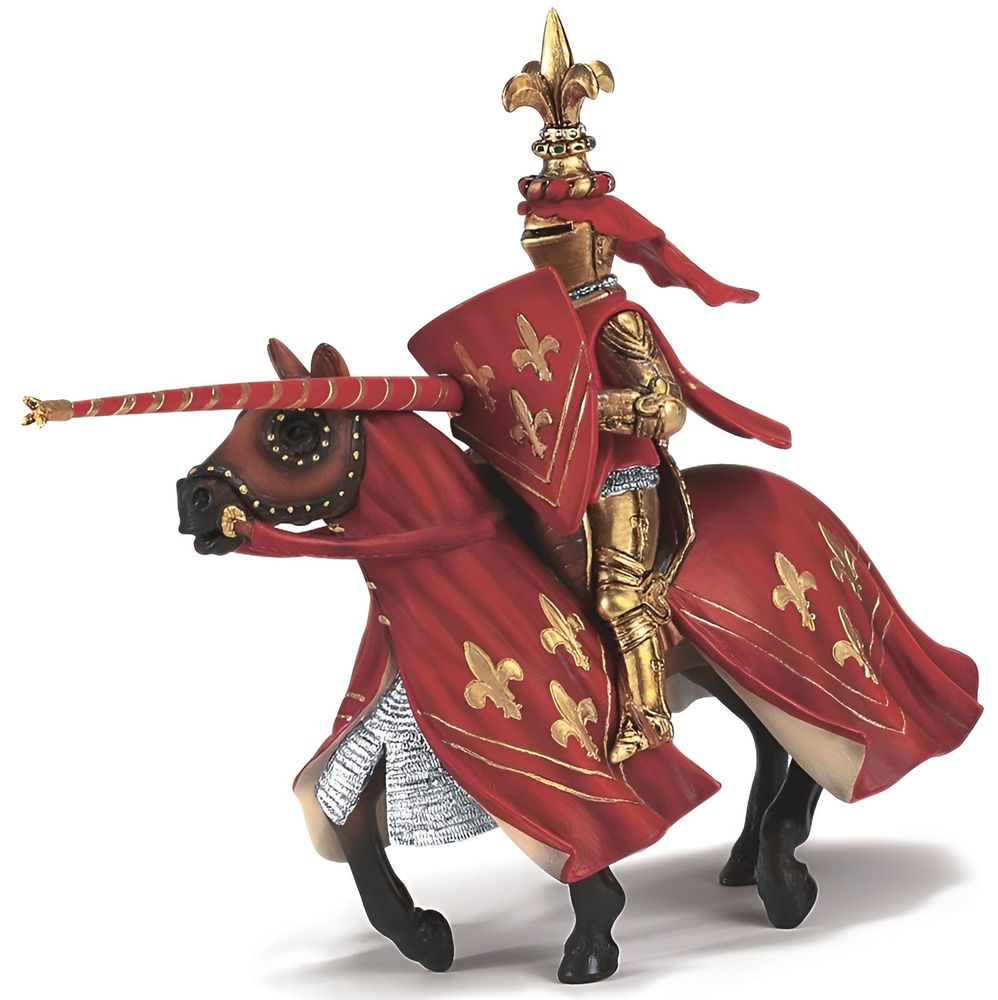 Mit dem Lilienwappen geschmückt ist dieser rot-goldene Ritter ein unerschrockener Teilnehmer am Turnier. Er hat schon viele solche Wettkämpfe gewonnen. Wie wird das Turnier wohl diesmal für ihn ausgehen. Mutig erhebt dein Schleich Ritter die Lanze und gibt seinem Schlachtross die Sporen.