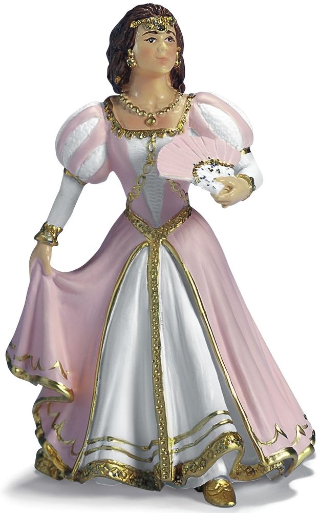 Die Prinzession trägt die feinsten, goldgewirkten Gewänder im Königreich und dazu eine wertvolle Kette und Spnge im Haar. Mit einem passenden Fächer fächelt sie sich kühle Luft zu.