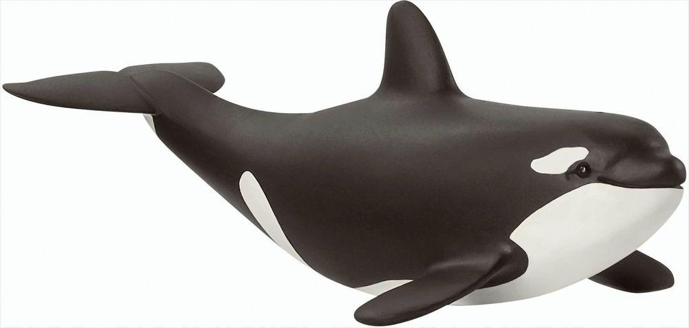 Der Orka wird auch Schwertwal genannt, weil er auf seinem Rücken eine Finne hat, die einem Schwert ähnelt. Die Tiere sind von allen anderen Walen leicht zu unterscheiden, denn sie sind sehr auffällig gefärbt: Während die Haut am Rücken pechschwarz ist, besitzen sie am Bauch strahlend weiße Haut, so wie das Orka Junges von Schleich Wild Life. Die Kälber beginnen schon nach einigen Monaten selbst auf die Jagd nach Fischen, Meeressäugern und Meeresvögeln zu gehen.