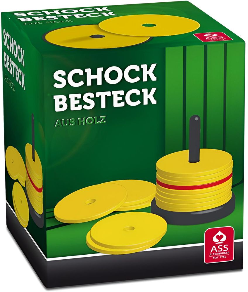 Hochwertiges Schockbesteck aus Holz mit 14 Holzscheiben und 1 Aufnahme-Dorn aus Holz