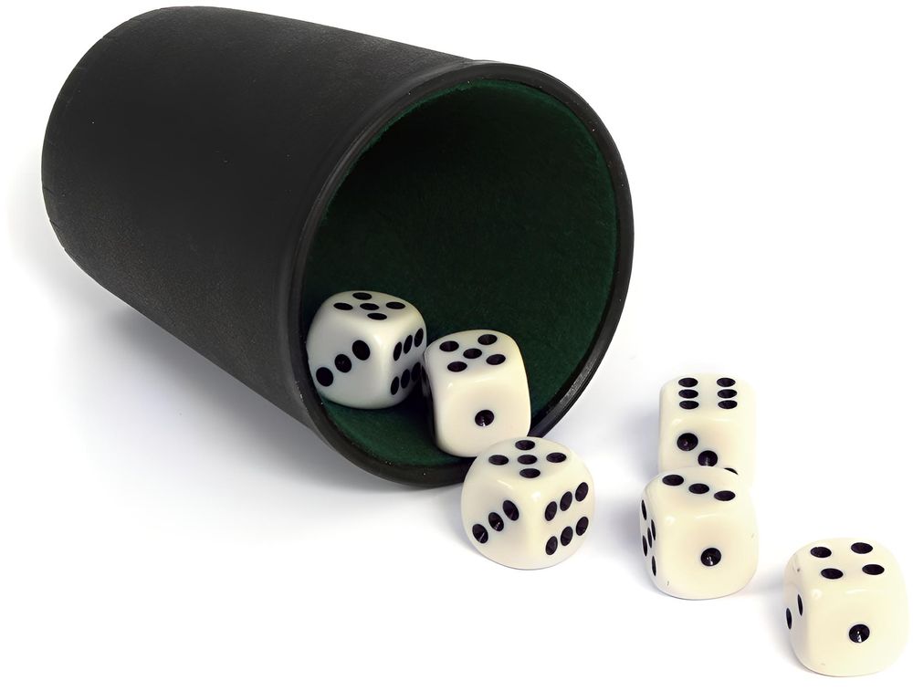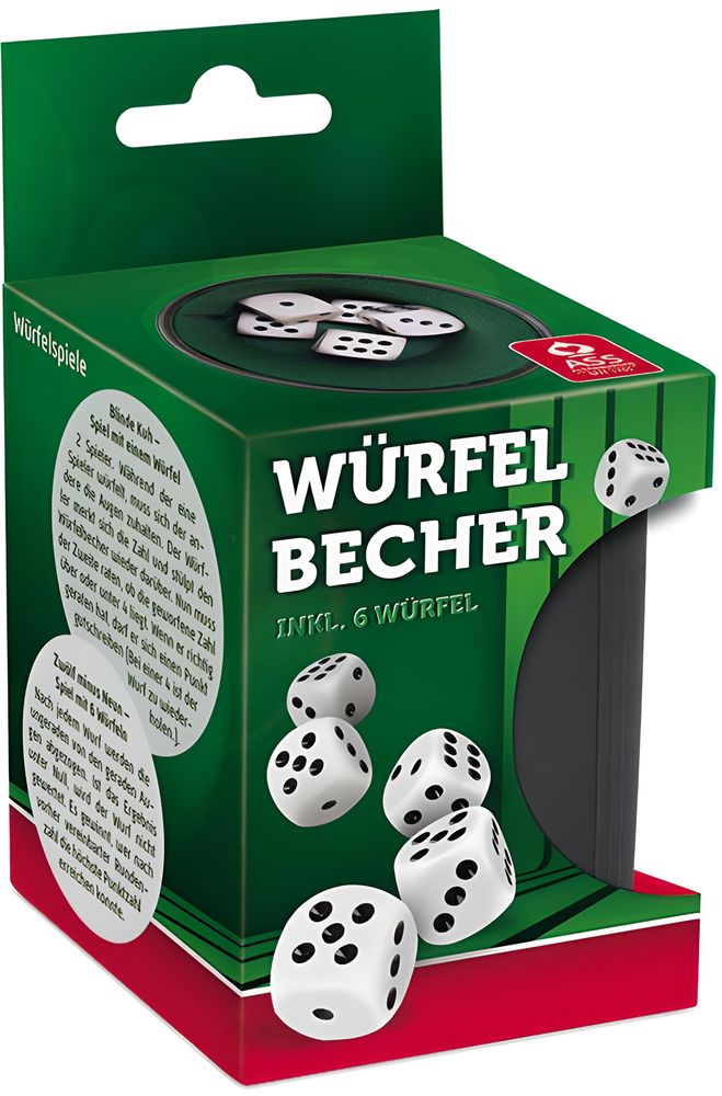 Ein Würfelbecher aus Kunststoff, 6 Würfel und ein Tisch: fertig sind die Utensilien für einen unterhaltsamen Spieleabend! Zwei Anleitungen für Würfelspiele sind auf der Packung enthalten, ansonsten sind Ihrer Phantasie keine Grenzen gesetzt. Viel Glück!