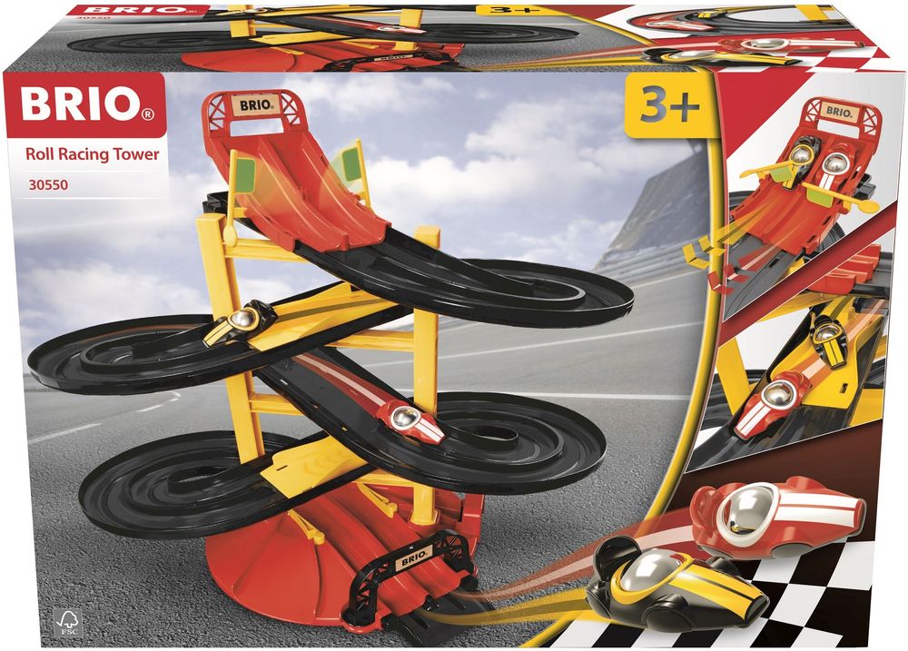 Fahre ein spannendes Autorennen mit dem BRIO Rennbahn-Turm. Stelle die beiden Rennautos im klassischen Design an den Start und hebe die Startflagge – den Rest erledigt die Schwerkraft. Entscheide selbst, ob der Sieger als Erster die Ziellinie erreichen muss oder ob der Wagen gewinnt, der am weitesten fährt. Doch pass auf, dass es an den Spurenkreuzungen nicht zum Crash kommt! Mit den modularen Schienenteilen kannst du verschiedene Rennstrecken bauen und immer wieder neue Rennen starten.