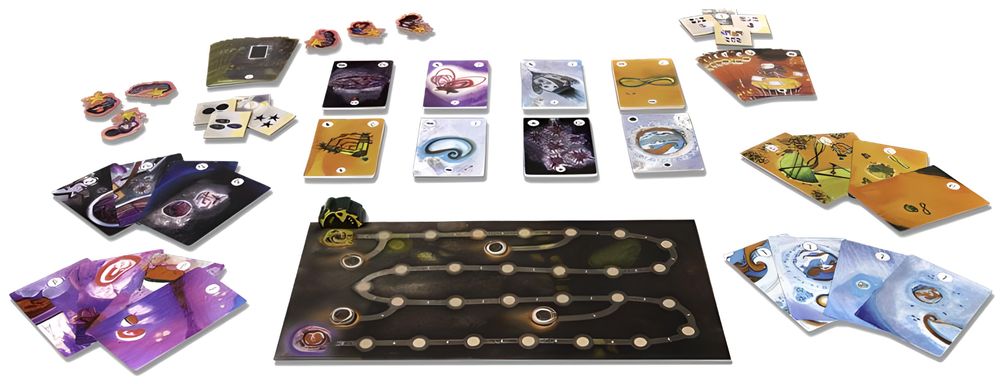 96 Karten, 18 Plättchen, 1 Unheimliche-Sonne-Figur, 1 Spielplan, 1 Regelheft