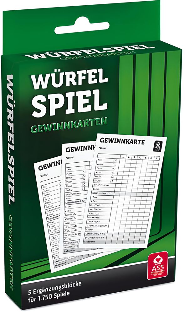 Für lustige und abwechslungsreiche Spielrunden sind neben Karten und Kartenspielen manchmal noch einige andere Dinge erforderlich. ASS Altenburger bietet alle Zubehörteile rund ums Kartenspiel an, um perfekte Spieleabende und -runden zu garantieren. Es gibt im Sortiment zahlreiche Spielblöcke, Würfel, Würfelbecher und -teller, Kartenmischer und -halter und viele andere Accessoires.
