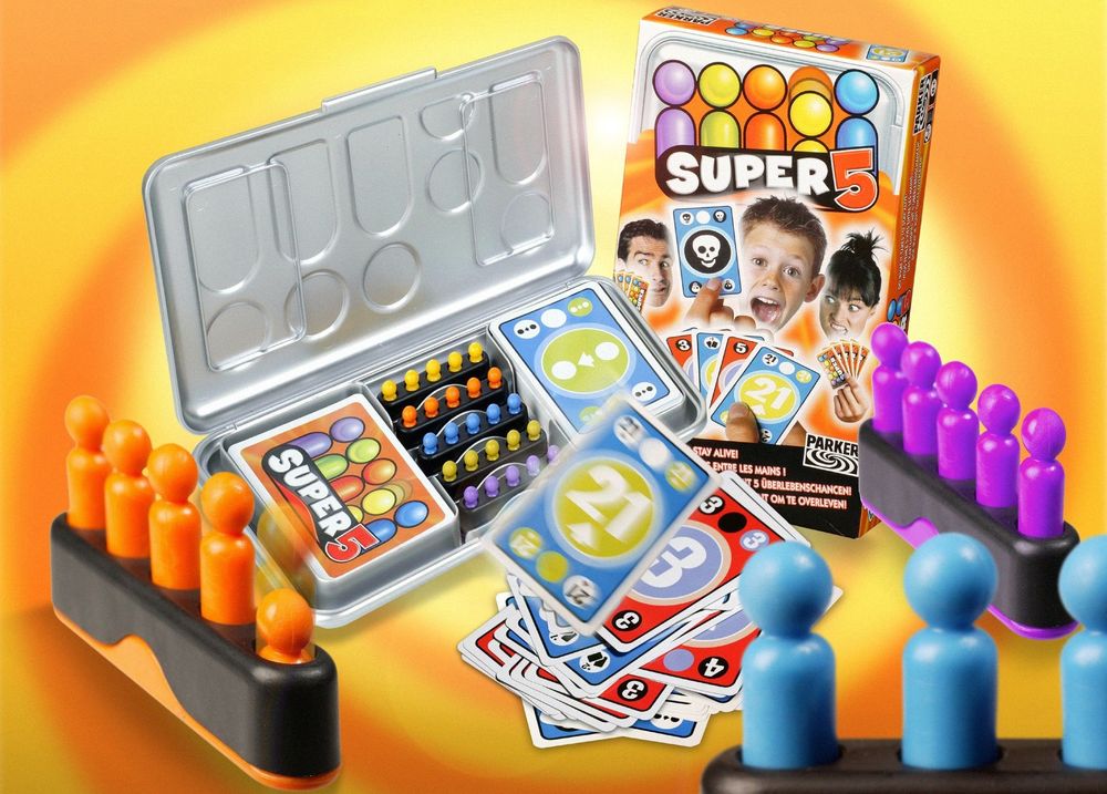Fünf Leben, zehn verschiedene Störerkarten und bloß nicht die 21 überschreiten. So einfach die Regeln auch sind, das neue Kartenspiel Super 5 von Parker bringt mit seinem abwechslungsreichen Spielprinzip Nervenkitzel und Action pur. Der Clou bei Super 5: Jeder Spieler verfügt über fünf Lebenslichter, welche durch kleine Figuren symbolisiert werden. Verliert der Spieler eine Runde oder kann auf bestimmte Störerkarten nicht adäquat reagieren, muss er ein Lebenslicht durch Herunterdrücken der Figur löschen. Wer es schafft, alle Karten auf seiner Hand auszuspielen, ohne die Gesamtsumme 21. des Kartenstapels zu überschreiten, beendet die Spielrunde damit und alle anderen Spieler verlieren ein Lebenslicht. Der Spieler, der am Ende der Partie als letzter noch über ein Lebenslicht verfügt, gewinnt. Da sind rote Wangen, Pokerface und Lachkrampf vorprogrammiert, denn bei Super 5 werden die Spielrunden nie langweilig. Dafür sorgen das klassische 17 und 4 Spielprinzip, ergänzt um spannende Aktionskarten, die das Spiel immer wieder in eine neue Richtung lenken. Ob Killerkarte., bei der sich die Spieler mit dem Ausspielen einer 0. ihr Lebenslicht retten, veränderten Kartendecks durch die Störerkarte Neuverteilung. oder Summe hoch auf 21.: Super 5 ist ein Kartenspiel, das seine Spieler in den Bann zieht, sie fasziniert und zu immer neuen Spielrunden animiert. Kurzum ein Spiel mit Suchtgefahr!