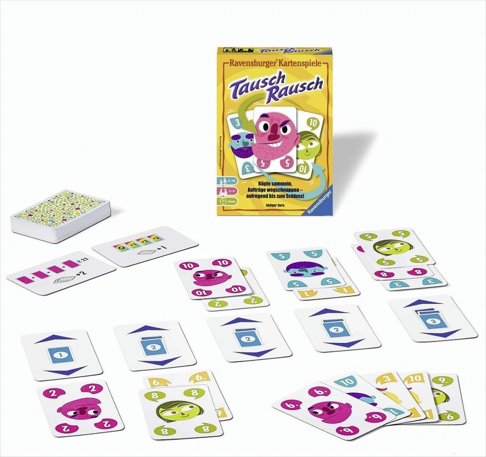 Karte für Karte tauschst du dich deinem Ziel näher: Erfülle als Erster fünf Aufträge. Jetzt bloß nicht dem Tausch-Rausch verfallen und die Aufträge aus den Augen verlieren. Denn schneller als du schauen kannst, ist der Auftrag von einem Mitspieler erfüllt und du hast Pech gehabt.