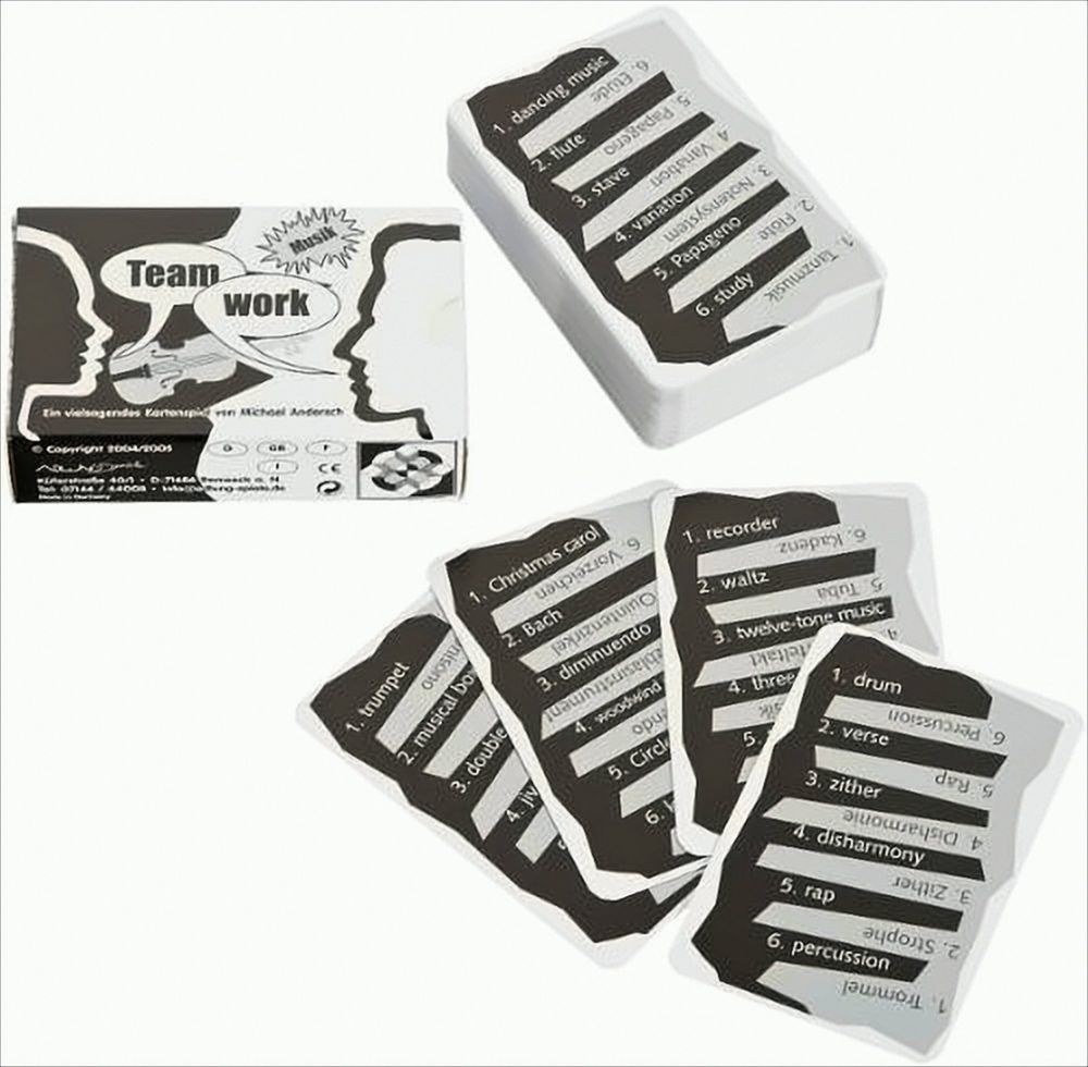 Teamwork-MusikNach dem großen Erfolg des Spieles TEAMWORK ?Original? wird es ständig weitere Themenbereiche mit speziellen Begriffen geben. Alle Karten aus den unterschiedlichen TEAMWORK Themenbereichen können zusammengemischt werden, um so einen größeren Fundus an Begriffen zu erhalten.