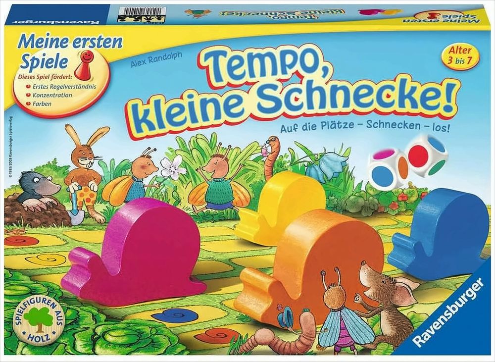 Sechs große, bunte Holzschnecken veranstalten im Garten einen Wettlauf. Wer wird wohl die Schnellste sein? Schon die Kleinsten sind von diesem einfachen Farbwürfelspiel begeistert. Ein beliebter Klassiker, der durch seine pfiffige Idee, die hochwertige Ausstattung aus Holz und die fröhliche Gestaltung überzeugt.