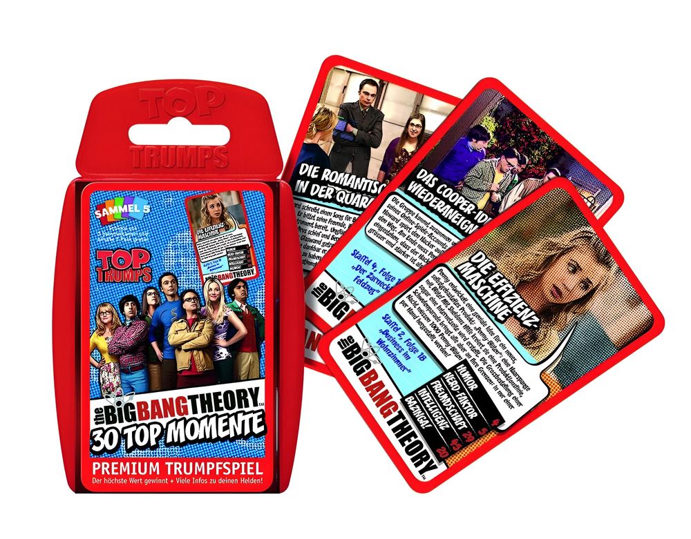 Und darum geht es beim TOP TRUMPS The Big Bang Theory - 30 Top Momente: Alle Spieler bekommen gleich viele Karten und dann wird gegeneinander getrumpft. Das heißt, wer den höchsten Wert hat, gewinnt die Runde und erhält die obersten Karten seiner Mitspieler, die er zusammen mit seiner eigenen unter seinen Kartenstapel steckt. Wer am Ende alle Karten besitzt, gewinnt.