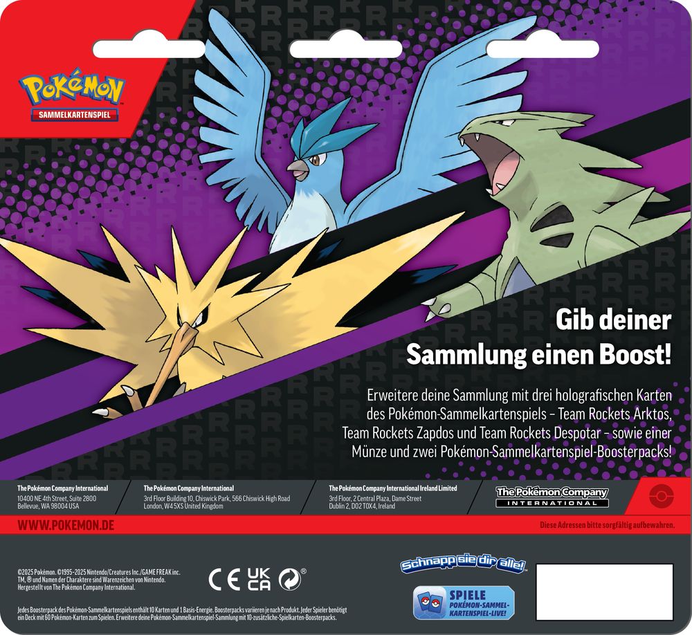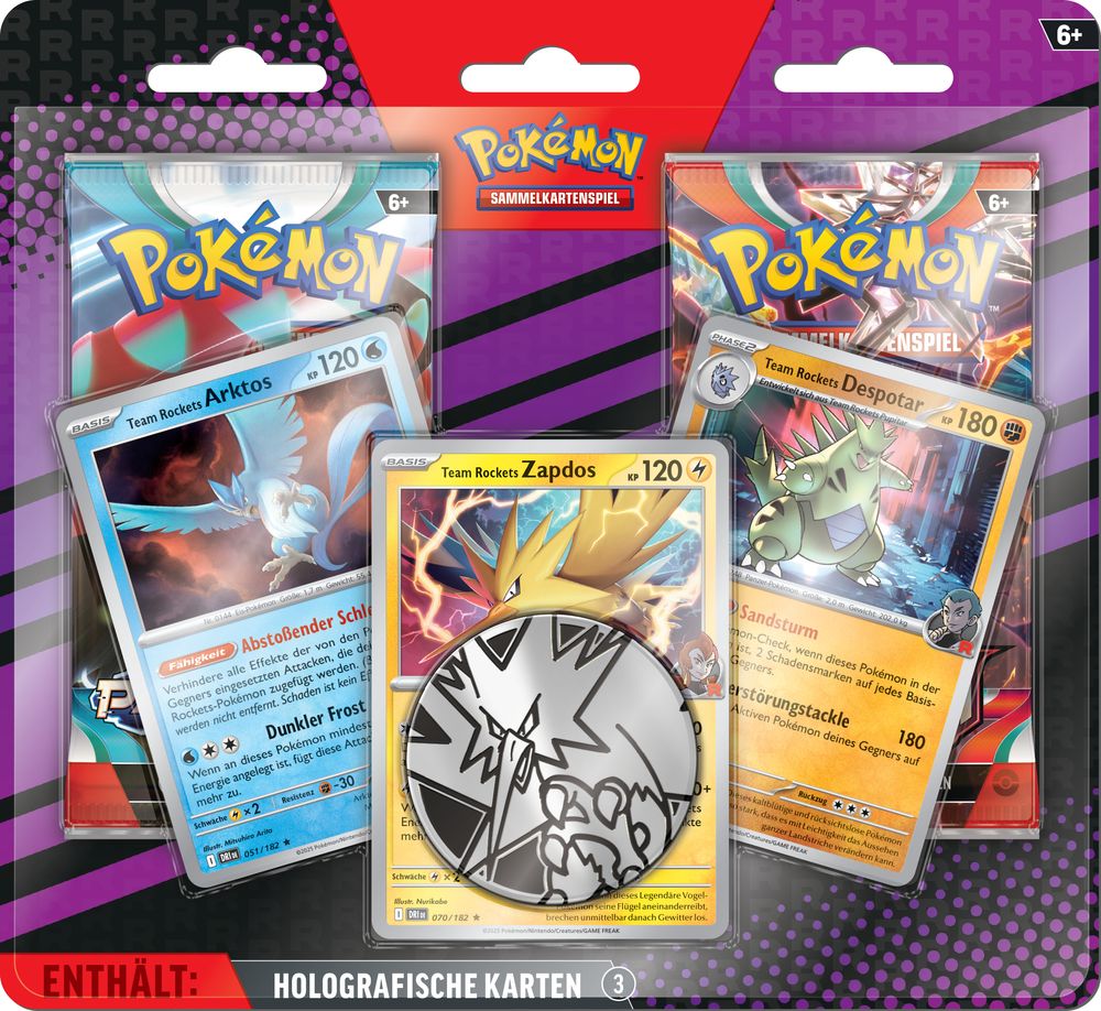 Erweitere deine Sammlung mit drei holografischen Karten des Pokémon-Sammelkartenspiels – Team Rockets Arktos, Team Rockets Zapdos und Team Rockets Despotar – sowie einer Münze und zwei Pokémon-Sammelkartenspiel-Boosterpacks!