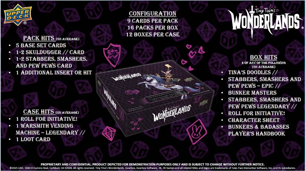 Das spannende und unvorhersehbare Sammelkartenset „Tiny Tina’s Wonderlands“ verkörpert die chaotische Energie einer Welt, die Tiny Tina selbst erschaffen hat! Sammle verrückte Charaktere, baue dein Arsenal auf und halte Ausschau nach Warsmith-Automatenkarten. Entdecke die Schauplätze in Wonderlands neu, finde Charakterbögen und Beutekarten! 100-Karten-Basisset mit einigen der bekanntesten Charaktere! o Parallelen sind Skuldugger und Diamond Binicorn! Rip-Karten-Beilage o Warsmith-Automaten – Ungewöhnliche, seltene, epische und legendäre Karten mit Seriennummern o Bunker Masters, Roll For Initiative und Charakterbogen-Karten