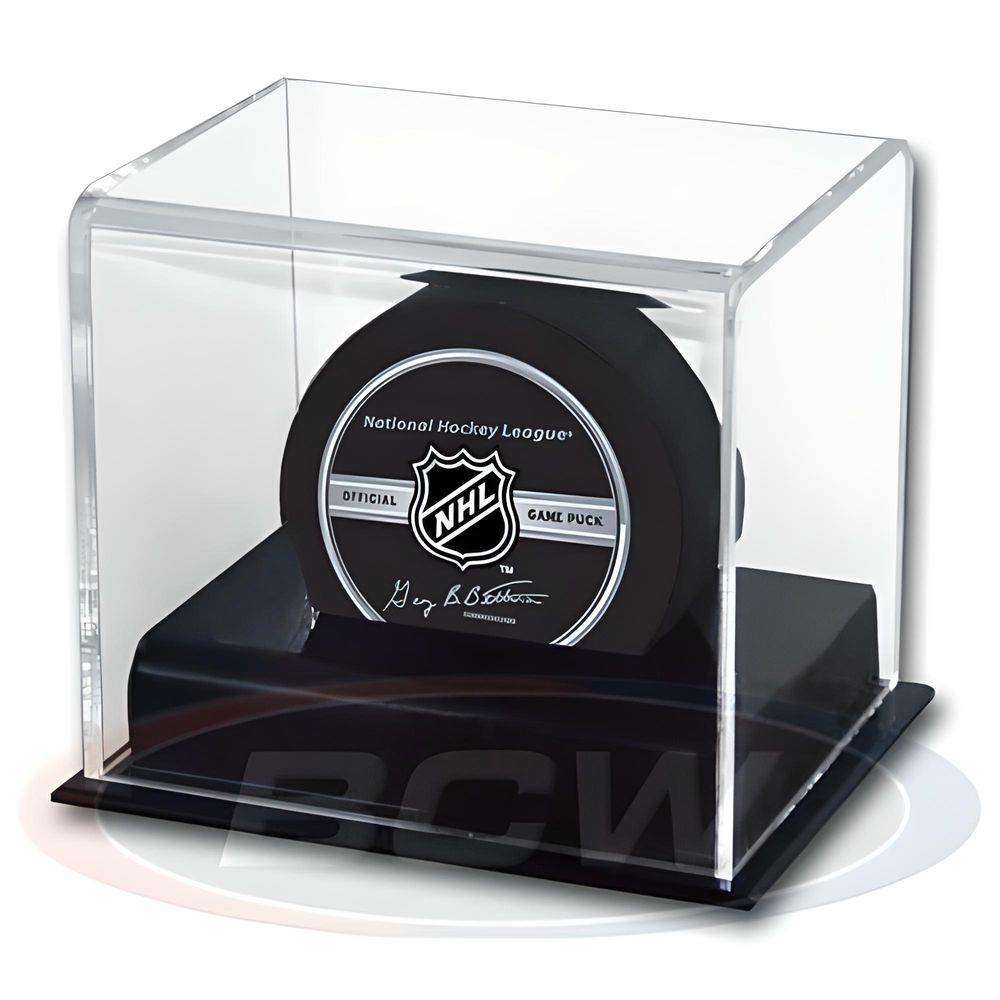 Das BCW Deluxe Acrylic Hockey Puck Display hat eine schwarze Basis mit einer klaren Abdeckung.