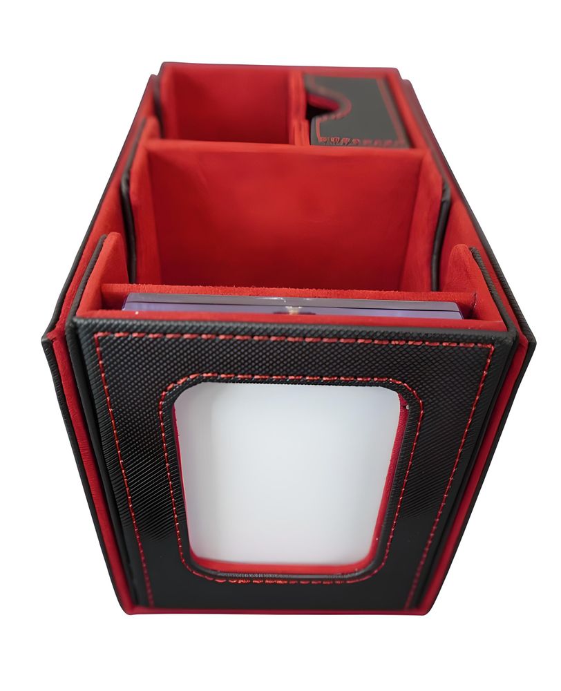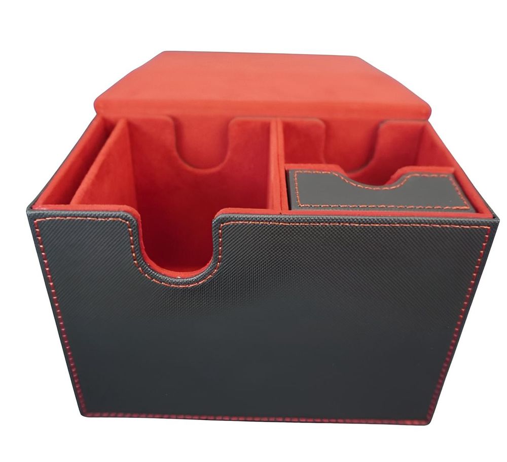 Deckbox mit zwei Kartenfächern: Platz für 100 + 60 doppelt gesleevte Standardkarten. Integriertes Dice Tray für Würfel, Tokens & Zubehör. Commander-Window für Magnetic Card Holder – zeig, was du spielst. Magnetischer, komplett abnehmbarer Deckel – platzsparend beim Spielen. Edles & robustes PU-Leder – langlebiger Schutz mit Stil. Universell einsetzbar für Magic: The Gathering, Pokémon, Yu-Gi-Oh!, One Piece TCG & mehr.