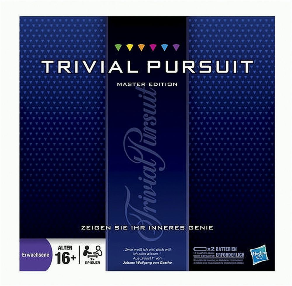 Ratefüchse weltweit beißen sich seit Jahren die Zähne an den beliebten Genus-Editionen aus. Nun bringt dir der aktuelle Nachfolger, die Trivial Pursuit Master Edition, jede Menge neue Fragen zu den beliebten Wissensgebieten. Immerhin 3.000 mal heißt es für dich: Grips beweisen und mit Bildung punkten.