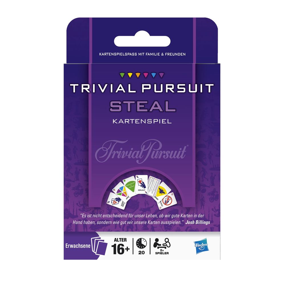 Beim neuen Trivial Pursuit Steal für Quizfreunde ab zwölf Jahren ist dein Grips gefragt. Beantworte möglichst viele der Fragen richtig und erhalte jeweils eine Wissensecken-Karte. Derjenige Spieler, der zuerst sechs verschiedene Karten sammeln konnte, erringt den Sieg. Aber Vorsicht: Ganz getreu des Namens der neuen Edition 'Steal' können die Mitspieler die Ecken jederzeit wieder stehlen.